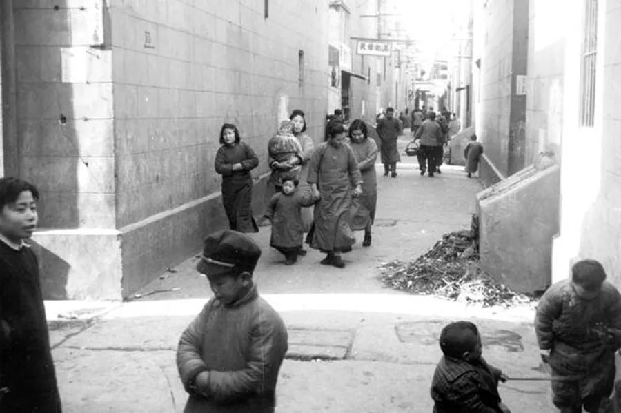 20世纪40年代,上海某弄堂中的情景。图中可见每个支弄口都有垃圾箱,但维护较差,环境堪忧