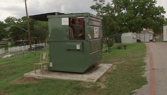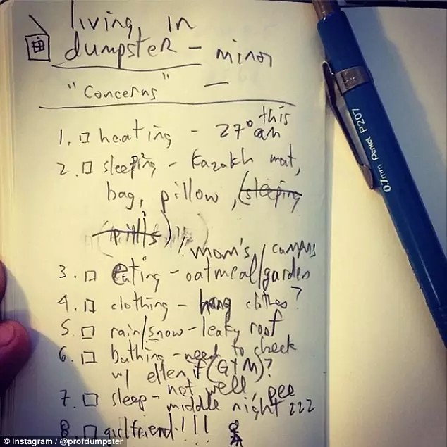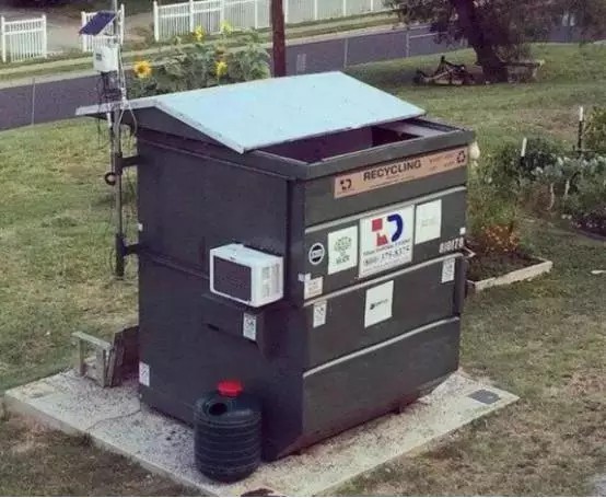 他飞跑去向教务长申请: “我想把校园草坪上的垃圾箱变成一个微小的可持续的家,并到里面去住。” 教务长虽然不是很懂这个教授的脑回路,但是想想垃圾箱也不贵,就同意了。