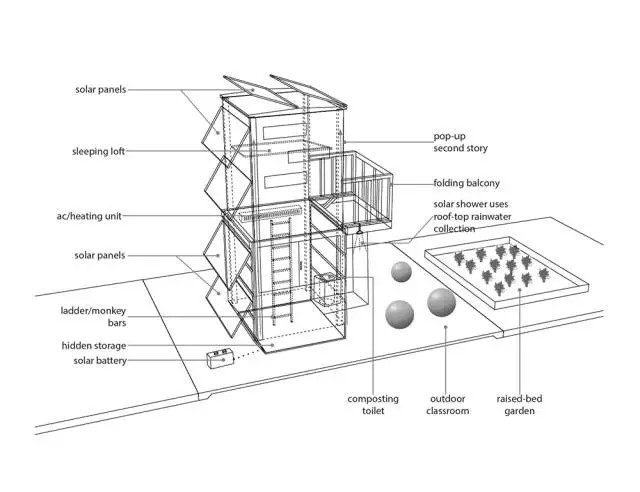 屋顶设计成三角形,不仅可以自由移动给室内通风,还内藏太阳能发电板。
