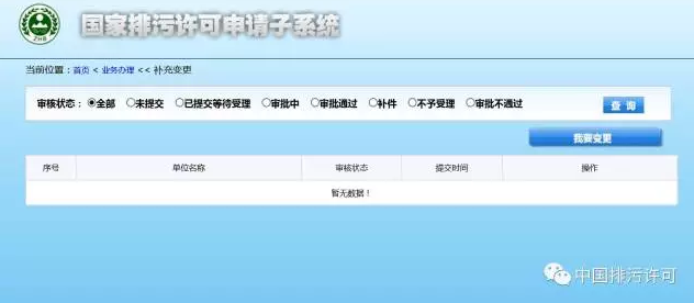 (1)排污单位点击进入“许可证变更”模块,点击页面中的“我要变更”按钮,即可填写排污许可证变更申请。