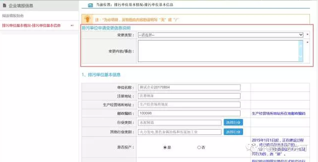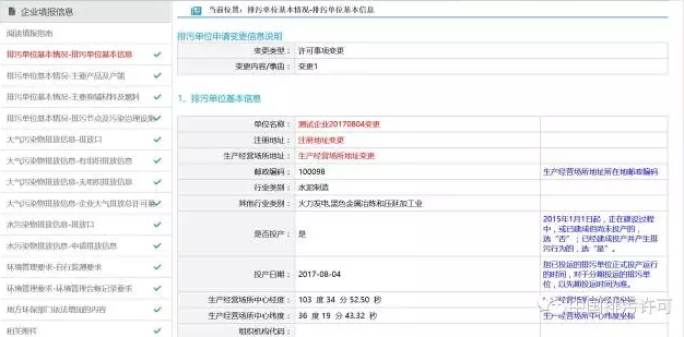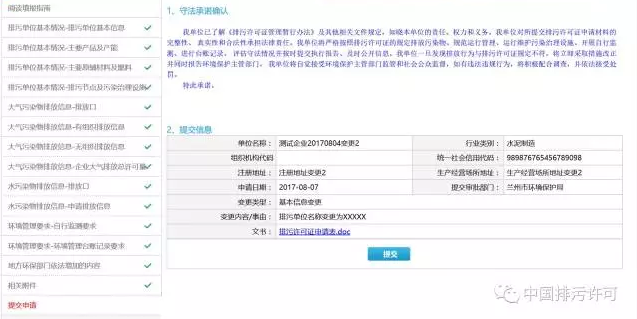 排污单位填写完所有信息后,点击“提交”按钮,即完成排污许可证变更申报。系统会对变更内容进行标识,绿色文字为排污单位变更过程中新增内容,红色文字为排污单位变更过程中修改内容。