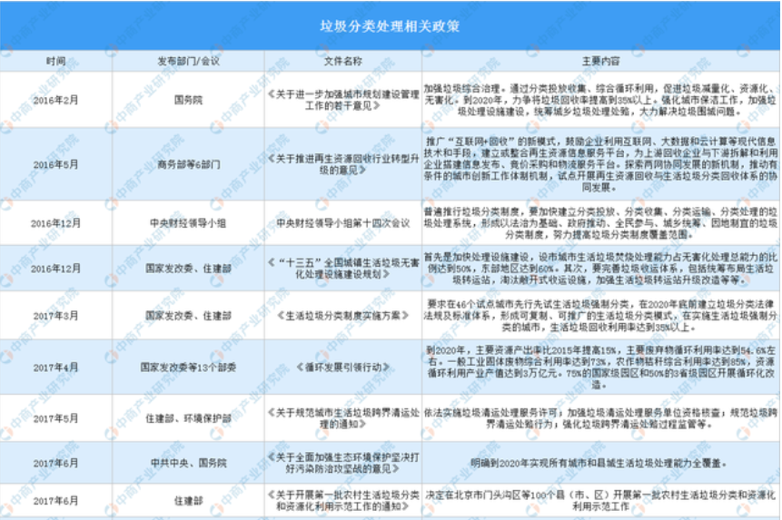 近年来,我国加速推行垃圾分类制度,2017年初,发改委及住建部联合下发《生活垃圾分类制度实施方案》,要求在46个试点城市先行先试生活垃圾强制分类。