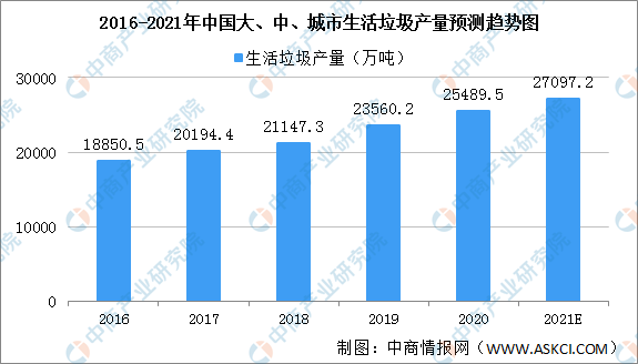 我国是人口大国,也是垃圾产生大国,且随着经济稳步发展、民众生活消费水平、城镇化率不断提高,生活垃圾产生量持续走高。2016年我国大、中城市生活垃圾产生量18850.5万吨,2019年生活垃圾产生量增至23560.2万吨。预计2021年我国生活垃圾产量27097.2万吨。