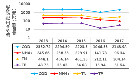 根据2013-2017年《中国统计年鉴》,我国废水排放总量保持在700亿吨,其中废水中COD、氨氮(NH4+)、总氮(TN)、TP排放量如下图,可见2015年国务院发布了《水污染防治行动计划》(简称“水十条”)后,这几种污染物排放量得到了削减。