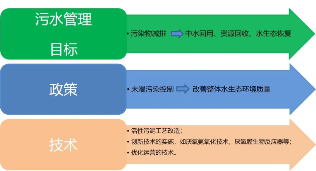 近几十年来,中国污水行业经历了高速增长,在基础设施建设、技术创新、人才培养等方面取得了进步,为未来的智慧化、低碳化、资源化发展奠定了坚实的基础。然而,未来仍然充满不确定性和挑战。预计随着人口的持续增长和城市化进程,水资源短缺将更加严重,而污水量将进一步增加。这将要求污水管理目标、政策和技术发生根本性变化,如下图: