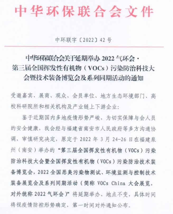 中华环保联合会关于延期举办2022气环会●第三届全国挥发性有机物( VOCs )污染防治科技大会暨技术装备博览会及系列同期活动的通知
