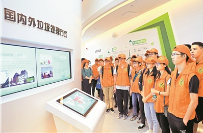 大学生在科普长廊参观并听讲解员讲述垃圾处理的先进经验。