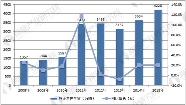 根据前瞻产业研究院发布的《危废处理行业市场前瞻与投资分析报告》统计数据,2015年全国危险废物产生量达4220万吨,较2014年增长16%。危废产生量仍呈现不断上升趋势。从发达国家的经验来看,危险废物产生量为固体废物的3%左右。我国近几年工业固废产量在30亿吨左右,估算当前危险废物的实际产量达6000-10000万吨。