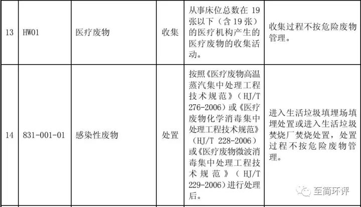 根据上文中将医疗废水污泥归类于医疗废物中的“感染性废物”(831-001-01),结合上表,豁免情况就很明朗了。即19张(含)床位数以下的医疗机构产生的医疗废物的收集活动,包括污泥,收集过程不按危险废物管理;另外,感染性废物,当然包括污泥处置环节不按危险废物处理。