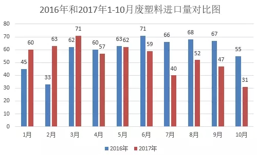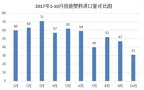 首先,我们看一下,2017年1-10月国内废塑料进口量变化情况(单位:万吨)