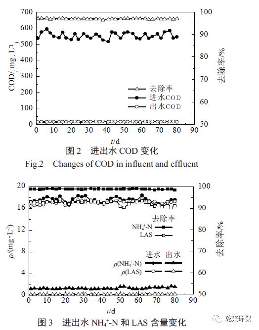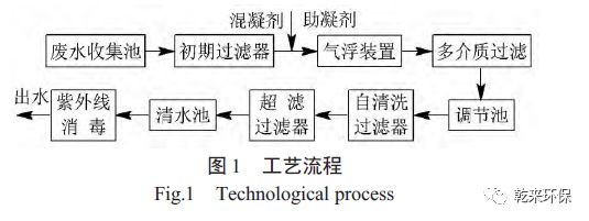 经过初步过滤的淋洗废水先经过混凝气浮作用,使淋洗废水中污染物的含量大幅度降低,COD、LAS、NH4+-N、浊度的去除率均可达到90%以上。再经过过滤、消毒处理,保证水质达到回用标准。
