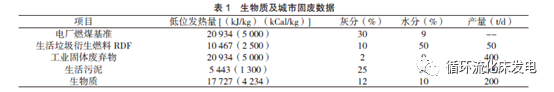 根据初步分析数据,拟利用的生物质、城市固废(生活垃圾、工业固体废弃物、生活污泥),其热值及数量情况如表1所示。