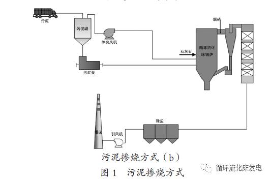 方式(b):生活污泥经污水处理厂脱水后运送至公司污泥罐,污泥罐下部布置污泥泵(柱塞泵)。污泥直接通过污泥泵输送至炉膛进行燃烧处理。污泥给入口布置播料风,同时布置插板阀以防止污泥系统停运时烟气反窜。污泥罐上部布置除臭风机,将罐内挥发气体送至炉膛进行燃烧净化。其污泥掺烧方式如图1(b)所示。