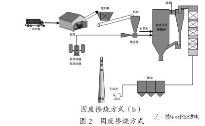 方式(b):使用气力输送系统将破碎后的固废输送至炉膛进行燃烧利用。其固废掺烧方式如图2(b)所示。