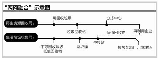 换句话说,原本孤立的城管部门的城市生活垃圾收集网和供销社系统的再生资源回收网,通过跨网协作,实现了“两网融合”。