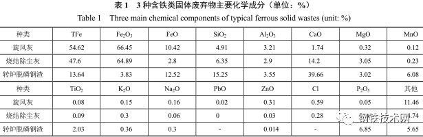 表 1 是 3 种含铁类固废产主要化学成分,产物含较高铁锰等元素,利用价值很大。
