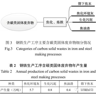 图 3 为各工序含碳类固体废弃物细分情况,包括筛下焦末、焦化环境灰、生化污泥和焦油渣。