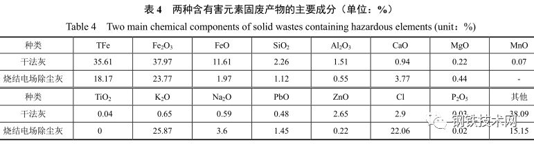 钢厂每年产生含钾、钠、锌等有害元素的固体废弃物约 8.5 万吨,表 4 是两种典型产物的检测成分。