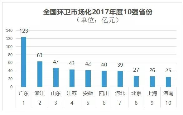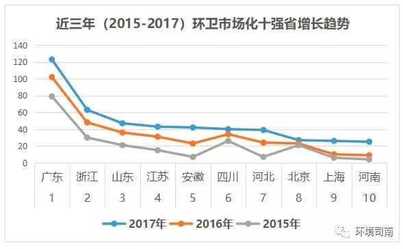 正基于此,一些人口大省和经济大省近年来受到环卫企业的追捧,在环卫市场化方面实现了跳跃式发展。比如河北省的环卫市场化份额从2015年的7亿,到2016年的24亿,再到2017年的39亿;河南省的环卫市场化份额从2015年的4亿,到2016年的9亿,再到2017年的25亿;安徽省的环卫市场化份额从2015年的7亿,到2016年的23亿,再到2017年的42亿……