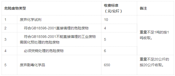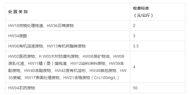 说明:上表处置类别以外的危险废物收费标准和危险废物运输费用由双方协商确定。