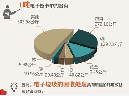 电子垃圾又称电子废弃物。含有毒有害的化学物质,如果处理不当或者废弃,会对环境造成污染,但同时电子垃圾中含有大量贵重金属,蕴藏的经济价值堪比“矿山”,欧盟一项调查显示:每5万部废旧手机可以拆解出1公斤黄金、10公斤银,价值相当于4万欧元。