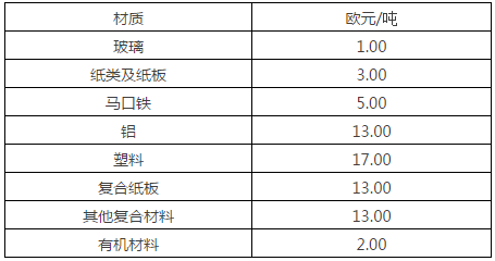 企业想要加入双轨系统,就必须交纳“绿点”商标的使用许可费。许可费主要用于支付DSD的管理成本、收运及分类成本、公众教育成本、广告成本。费用的多少是按照包装材料的类型和重量计算的,计算时将包装材料分为8类,分别为玻璃、纸类及纸板、马口铁、铝、塑料、复合纸板(纸质饮料包装)、其他复合材料、有机材料。在计算费用时,首先将包装分解成这八种组成部分,然后根据每个包装中含有的材质重量、对应材质的价格、包装在市场上的发放量,来计算加入费用。《包装条例》在经过多次修订后,不再要求企业必须在包装上印刷“绿点”标识,但企业仍可选择向DSD支付使用费,在包装上印刷该标识。