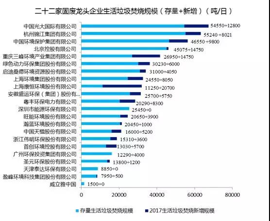 业绩图显示,与上一年相比,2017 年二十二家固废龙头企业新增生活垃圾焚烧总规模 119421吨/日,增速约23%;其中,上海康恒环境股份有限公司、重庆三峰环境产业集团有限公司业绩增量最为显著。