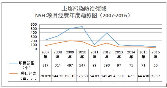通过统计2007-2016十年内我国国家自然科学基金的项目数据,可知土壤污染防治领域的项目经费在2007-2010年呈稳步上升趋势,2010年申请通过的项目达峰值547个,2011年有所回落,2012年又激增到390个,之后几年呈现了下降趋势,2016年仅通过55个项目,经费也随之下降,如图9所示。