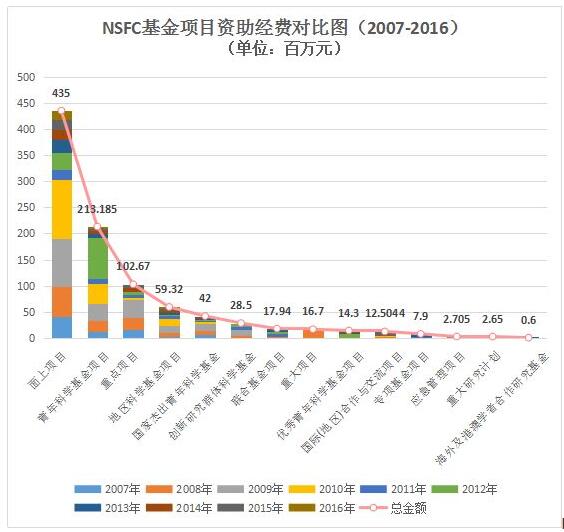 图10国家自然科学基金项目资助经费对比图(2007-2016年)
