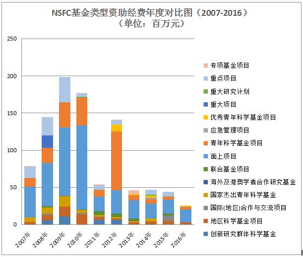 图11国家自然科学基金基金类型资助经费年度对比图(2007-2016年)