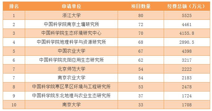 通过项目数据分析(见图10),土壤污染防治领域在面上项目获得的经费十年总经费额度排名第一,共计4.35亿元,青年科学基金项目排名第二,约为2.13亿元。排名第三位的为重点项目,共计1.02亿元。面上项目是相对于重点项目而言,由于选题广泛所以占比比其他类型要高。但是由于2013年起基金委出台新政策,严格把控项目质量。因此导致近几年资助经费呈下降走势。