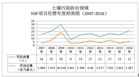 通过项目数据分析(见图12),在土壤污染防治领域,美国国家科学基金资助经费在2007年至2009年呈现了稳步递增的趋势,2009年项目数量达到峰值30个。2010年出现拐点,项目数量下降为8个,2011年又开始回升,之后5年一直较为平稳,2016年有所增加,达到21个。