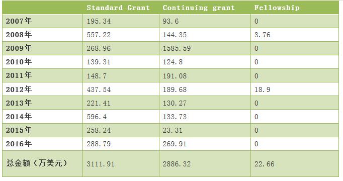 表8美国国家科学基金项目资助类型经费表(2007-2016年)