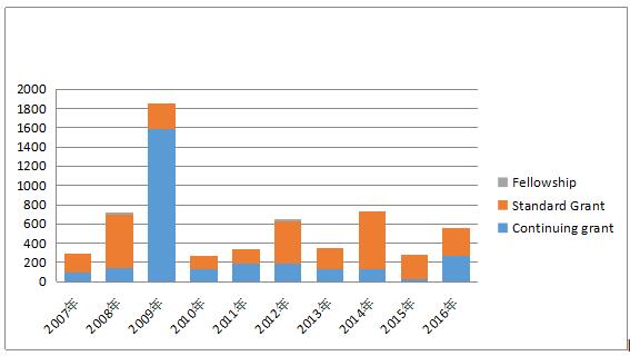 图12:美国国家科学基金项目资助经费年度趋势图(2007-2016)