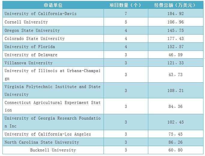 根据统计,本领域申请年份在2007年至2016年间,共有135个机构申请了美国国家科学基金。其中申请数量超过2个的机构有14个获得经费约为1496.8万美元,如表9所示。