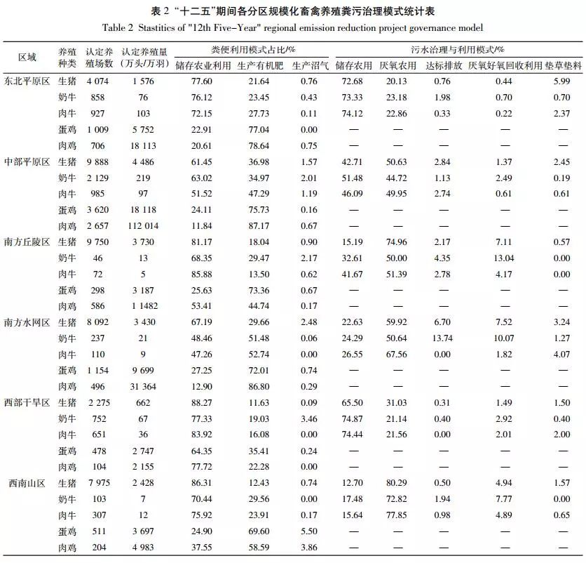 参考代思汝对我国畜禽养殖污染防治模式分区研究,根据我国农业经济自然条件,结合我国畜禽养殖分布和粪污治理现状,将我国(不包含港澳台、西藏以及南沙群岛)分为6个区,分别为:东北平原区、中部平原区、南方丘陵区、南方水网区、西部干旱区、西南山区,按分区对规模化畜禽养殖粪污治理模式进行统计,结果如表2。