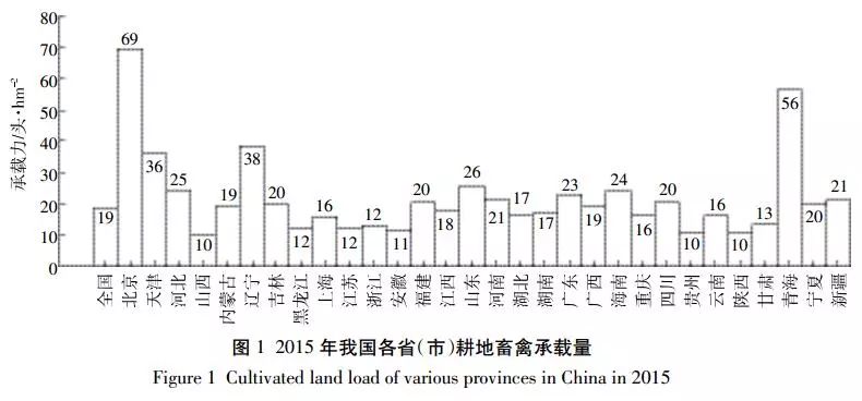 根据生猪当量产氮量系数折算,换算比例为7.4只蛋鸡、61.7只肉鸡折算为一头猪,一头奶牛折算为28.59头猪,一头肉牛折算为19.14头猪。通过查阅2016年《中国畜牧业年鉴》和《中国国家统计年鉴》,2015年我国农作物播种面积为166374000hm2,2015年年末折算生猪当量养殖量为308305万头,我国现有耕地畜禽承载量平均为19头˙hm-2。同时对我国各省地区之间的畜禽承载量进行了统计分析,如图1。