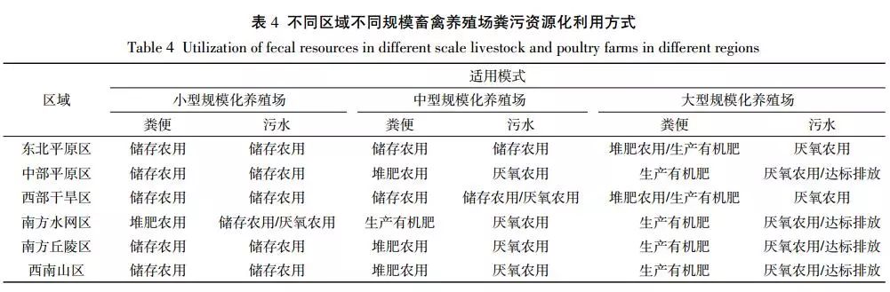 通过总结现有养殖场粪污资源化利用的经验与存在的问题,根据各区域特点,优选适合各区域不同规模畜禽养殖场粪污资源化利用方式,如表4。