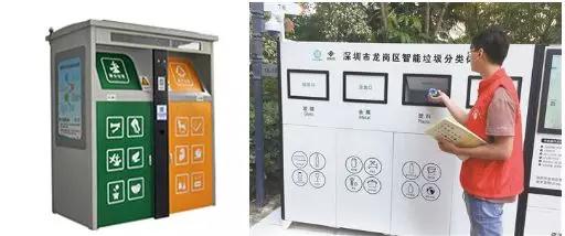 智能垃圾分类回收箱:智能垃圾分类回收箱外表像组合型储物柜,由一台积分兑换机(售货机)、一台会员操控机及几个分类回收箱体组成。这台箱设有几个废弃物回收口,分别用于回收不同垃圾。通过智能卡扫码后,回收口挡板会自动打开,居民即可将废弃物投入箱内。回收箱会对垃圾进行计量,并上传数据至居民的环保账户用于变现。