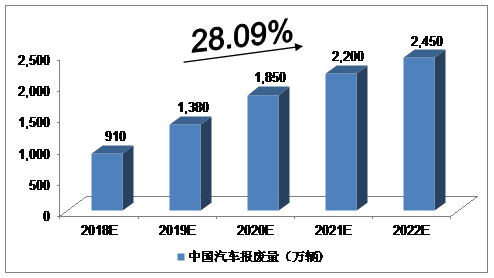 综合以上因素,我们预计,2018年中国汽车报废量将达到910万辆,未来五年(2018-2022)年均复合增长率约为28.09%,2022年中国汽车报废量将达到2450万辆。