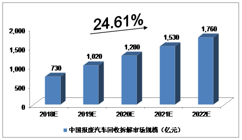 综合以上因素,我们预计,2018年中国报废汽车回收拆解市场规模将达到730亿元,未来五年(2018-2022)年均复合增长率约为24.61%,2022年中国报废汽车回收拆解市场规模将达到1760亿元。