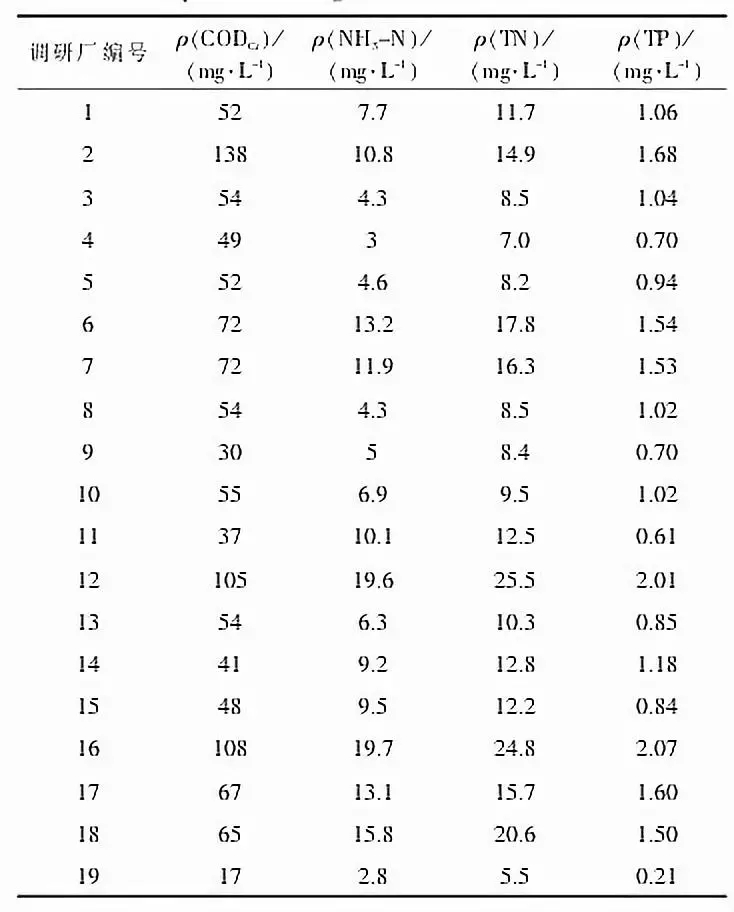 巢湖流域现有村镇污水处理厂实际进水水质调研结果