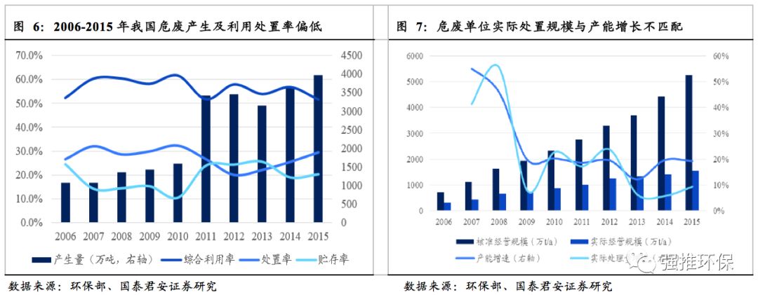 现有危废资质中,产能兑现比例低。2015年我国已核准危废处置产能总量5263万吨,其中无害化982万吨。按照2015年约1亿吨危废产量核算,产能缺口约为50%,而实际综合利用+处置率约25%。其中显著的差距主要来源于两方面: