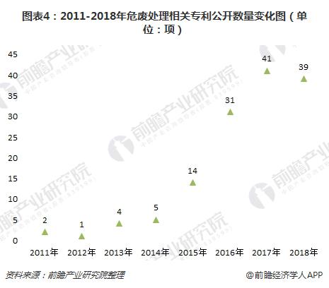 在公开专利数量方面,2011-2017年,我国危废处理专利公开数量总体上呈趋势。2017年,我国危废处理专利公开数量为41项,达到近年来最大值;截至2018年7月,专利公开数量为39项。