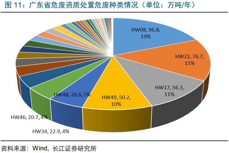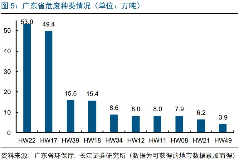 广东省危废种类中前5位的HW08(含油污泥,96.8万吨,占总资质的20%)/HW22(含铜废物,76.7万吨,占总资质的15%)/HW17(表面处理污泥,56.3万吨,占总资质的11%)/HW49(其他废物,50.2万吨,占总资质的10%)/HW48(有色金属冶炼废物,26.6万吨,占总资质的5%)合计占总资质61%,危废资质种类集中度高。