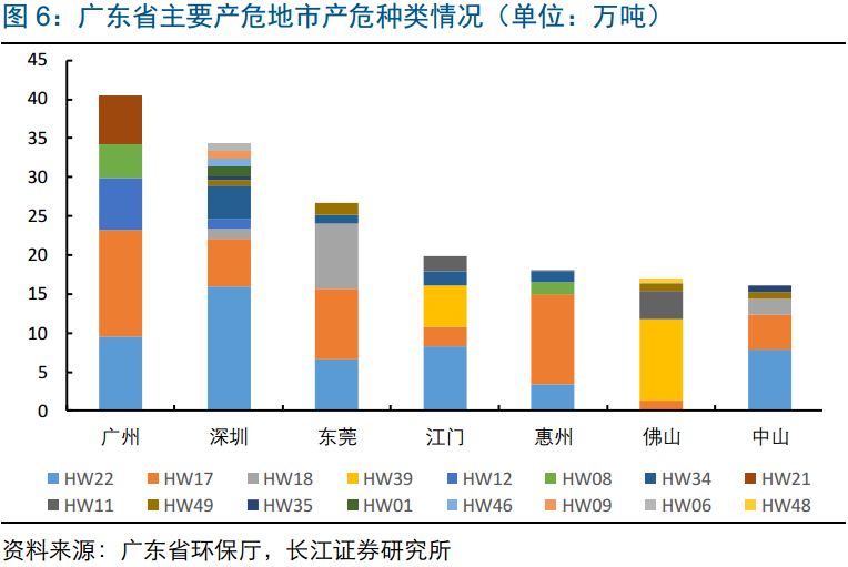 东莞市(2017年数据):产危量较多的分别是HW17(表面处理废物,9万吨)/HW18(焚烧残渣,8.4万吨)/HW22(含铜废物,6.7万吨)/HW49(其他废物,1.5万吨)/HW34(废酸,1.2万吨);