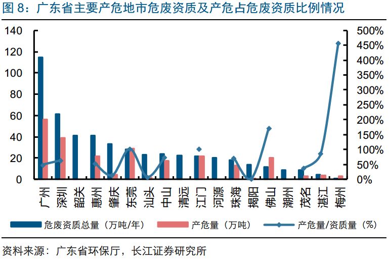 揭阳/汕头/肇庆/茂名危废产量/危废资质量占比较低(比例分别为2%、7%、13%、36%),危废资质供给量相对充裕;