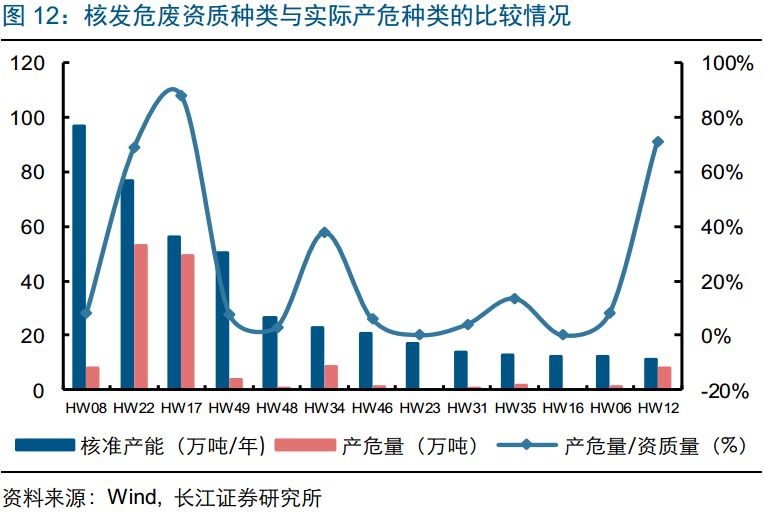HW48(有色金属冶炼废物)/08(含油污泥)/49(其他废物)比例均未超过10%,核发的资质超量严重,这或与地方规划不严谨及实际产危数据未充分曝光有关。