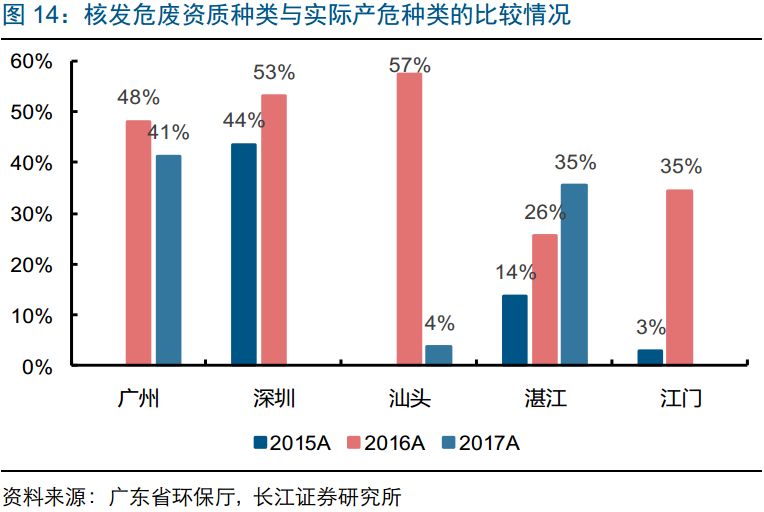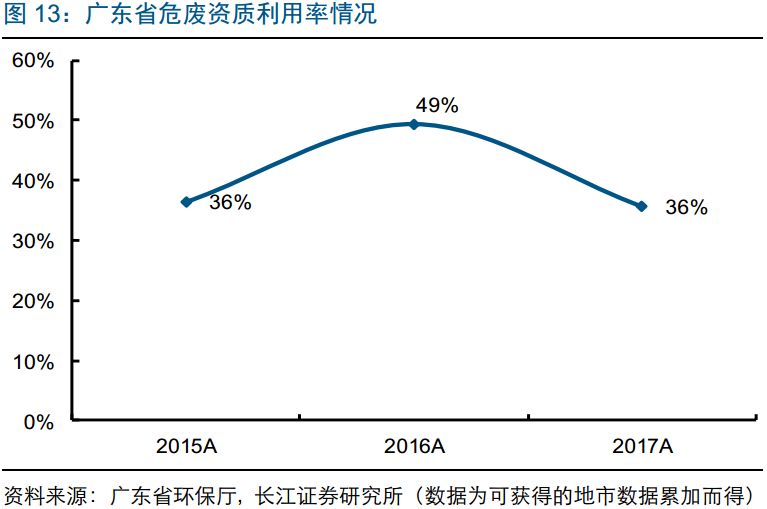 2015-2017年广东省危废资质利用率分别为36%、49%、36%,广州和深圳资质利用率在40%-50%之间。