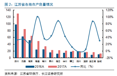 受环保督察等监管趋严的影响,2017年江苏省危废产量约509万吨,同比增37%,苏州、无锡合计占比42%,可获得数据的13个地市除了扬州产危来量略降2%,剩下地市产危量都出现不同程度的增加,其中南通(101%)、宿迁(89%)、连云港(88%)、泰州(44%)增速靠前。